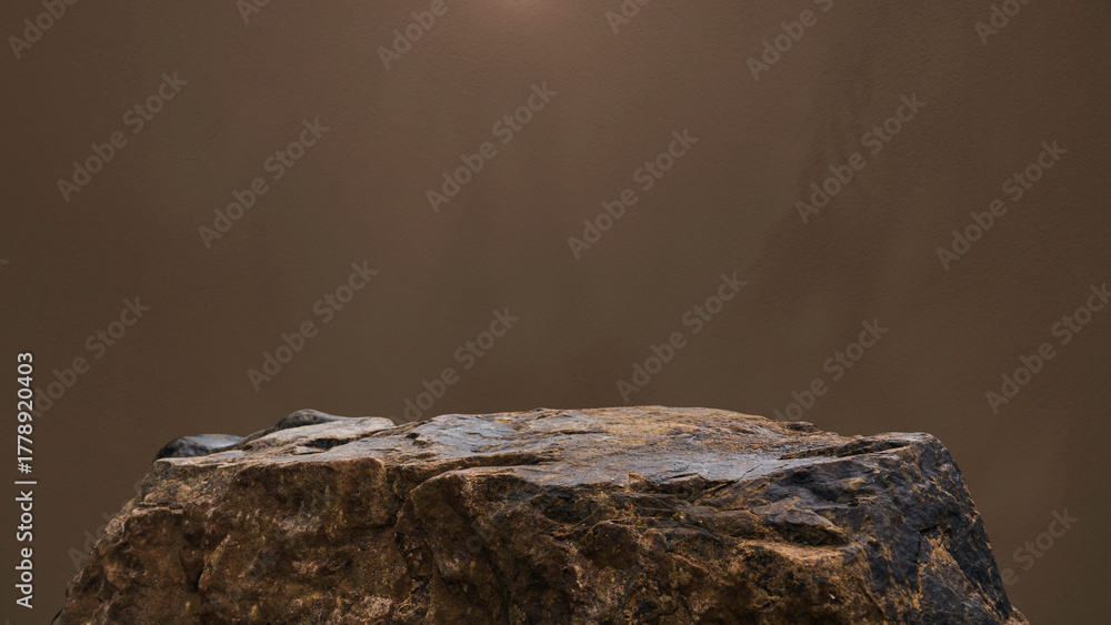 Fototapeta na wymiar - Rock, Brown Stone Podium stand floor display advertising product Background, Production show with Studio beige Dark light wall room well empty space for text, Cliff Rock Stone stage, Clipping path.