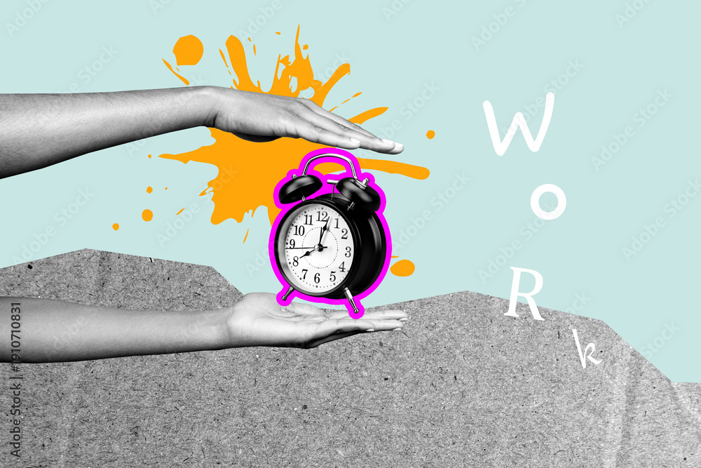 Fototapeta na wymiar - Composite sketch image design artwork collage of two huge hand hold between clock control hurry work business time work human resources.