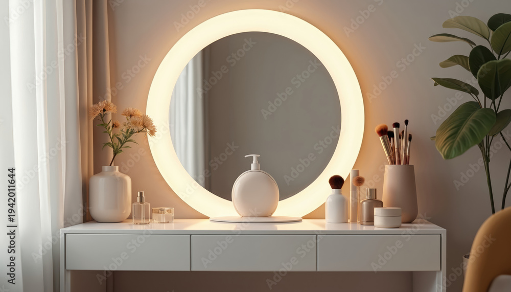 Fototapeta na wymiar - Modern white dressing table with round illuminated mirror. Makeup brushes, skincare bottles, vase with flowers on vanity. Elegant bedroom furniture, beauty station..