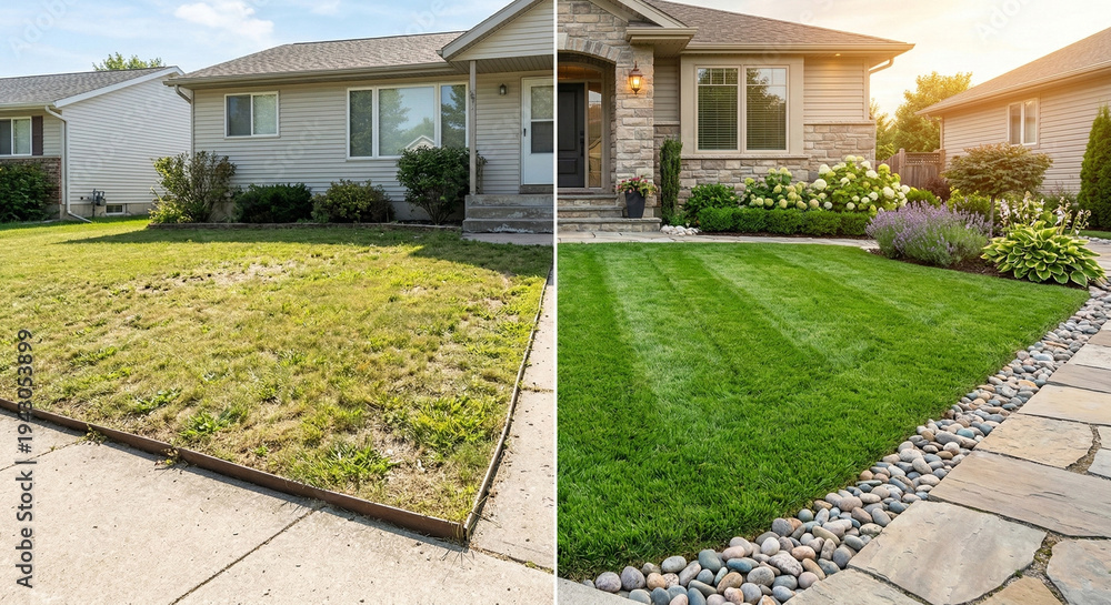 Fototapeta na wymiar - Before and after transformation of a residential house exterior and garden..
