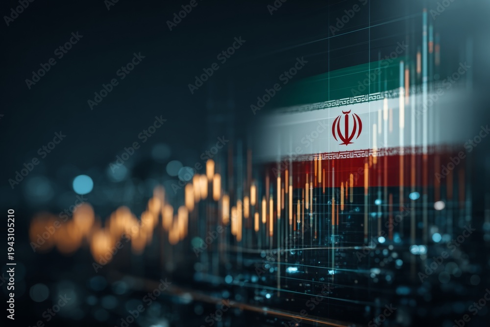 Fototapeta na wymiar - Turbulent skies: the flag standing firm in a war zone. Stock market. Fierce battlegrounds: iranian flag with expansive explosions and dense smoke. Stock performance. Investment trends..