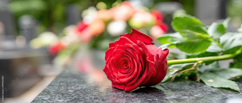Fototapeta na wymiar - Close-up view of a red rose placed on a black granite tombstone in a cemetery with blurred grave markers behind it.