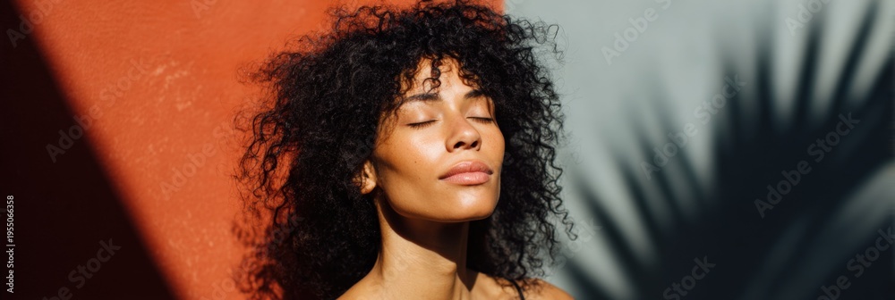 Fototapeta na wymiar - African female young sunlit portrait with curly hair eyes closed palm shadow on red and gray wall cinematic light.