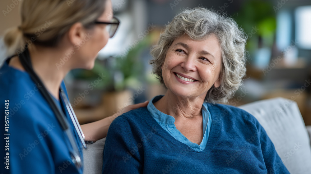 Fototapeta na wymiar - Palliative care physician having goals-of-care conversation with elderly patient in sunlit hospice room, mutual respect visible, patient autonomy centered, dignified healthcare par.
