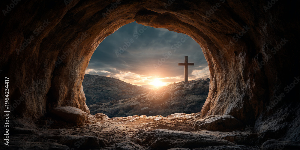 Fototapeta na wymiar - Empty Tomb View of Christian Cross on a Hill at Sunrise for Easter Resurrection .
