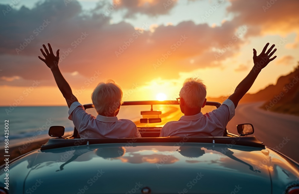 Fototapeta na wymiar - Elderly couple enjoys sunset drive in convertible car. Arms raised, they celebrate life, ocean waves, and a scenic coastal road journey. Pure joy and freedom..