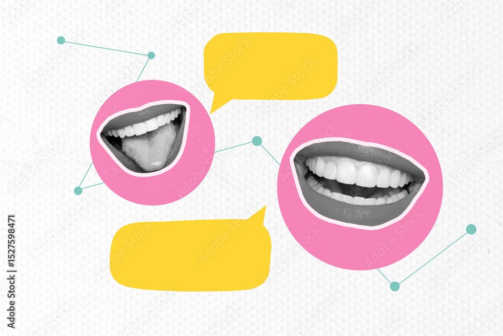 Fototapeta na wymiar - Trend composite sketch template photo collage of text box comic note speech message two silhouette mouth rumor talking lips fragment face.