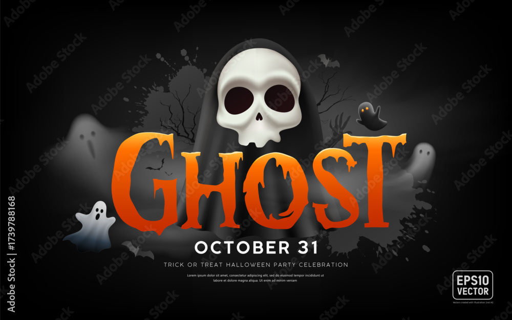 Fototapeta na wymiar - Happy Halloween ghost orange text, Scary skull ghost, poster banner design on black background, Eps 10 vector illustration.