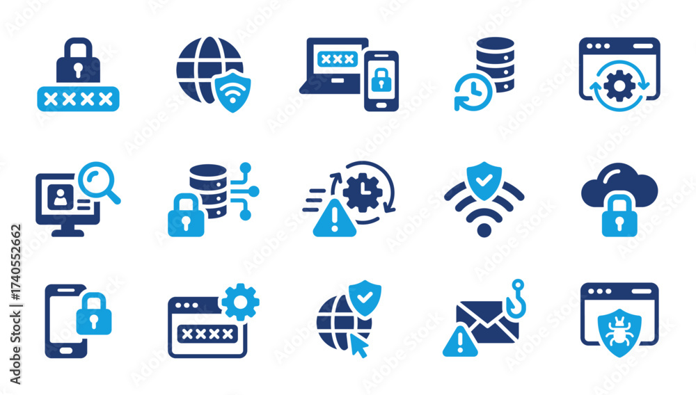 Fototapeta na wymiar - Flat vector icon set about cybersecurity and information security, including password protection, data backup, malware, phishing and more..