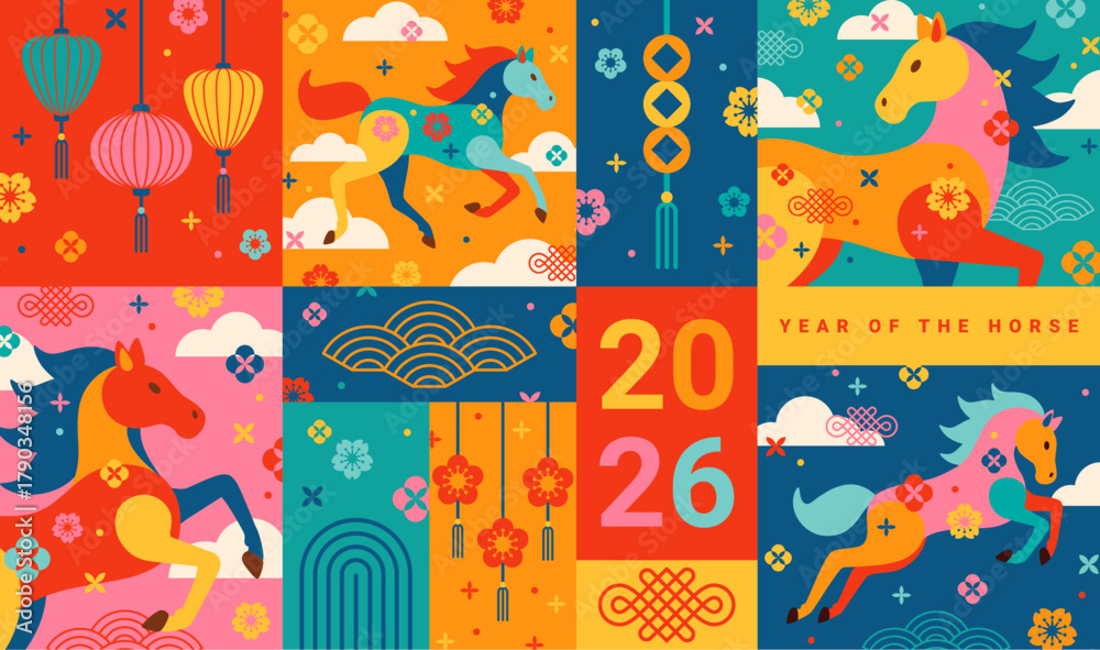 >Fototapety na wymiar>Wybrane motywy - zobacz więcej !>Kolej>Happy Chinese New Year 2026 Year of the Horse. Vector illustration. Color China Christmas poster banner floral asian pattern. Spring holiday design funny geometric Japanese background.