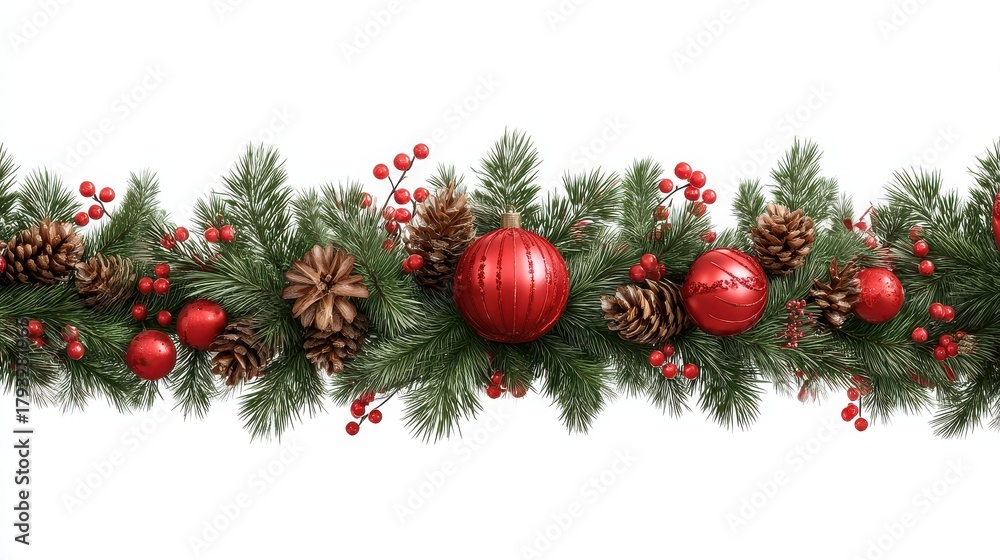 >Fototapety na wymiar>Wybrane motywy - zobacz więcej !>Kolej>photo of a horizontal christmas garland crafted from fir branches pinecones vibrant red berries and shiny red ornaments isolated on white isolated on transparent background