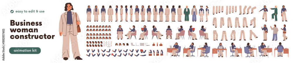>Fototapety na wymiar>Wybrane motywy - zobacz więcej !>Kolej>Business woman constructor, body parts and poses set. Office worker, female employee character from different sides, animation elements kit. Flat vector illustration isolated on white background