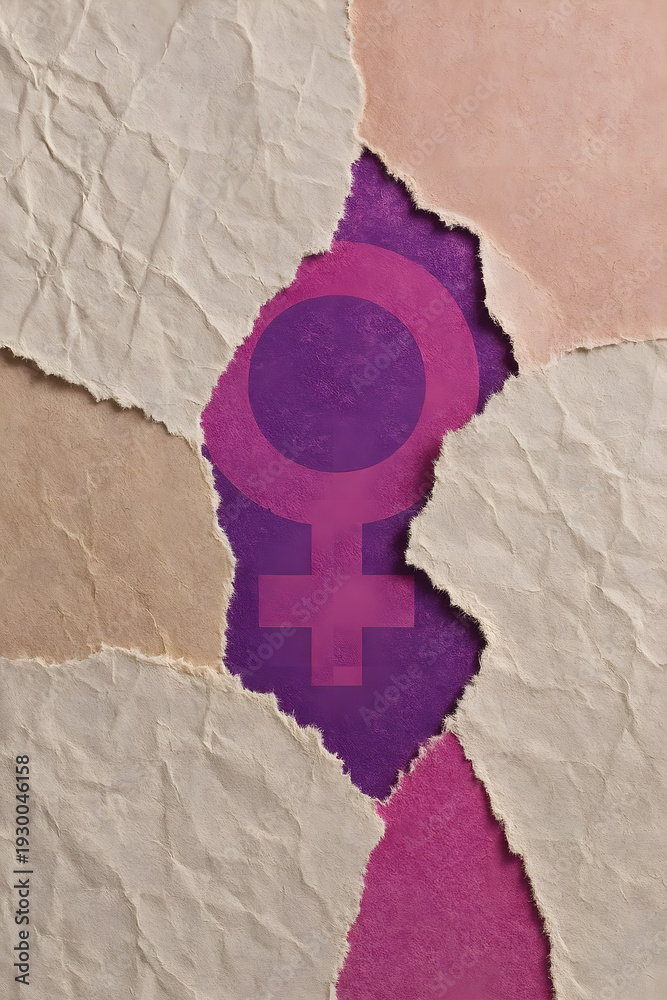 Fototapeta na wymiar - Minimalist torn paper collage with feminist ♀ symbol, bold violet-pink accents, distressed textures, cinematic lighting, realistic fibers, abstract seamless background..