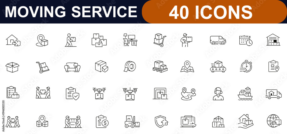Fototapeta na wymiar - Moving Service web icons in line style. Relocation, packing boxes, office moving, courier delivery, movers, transport, logistics set. Editable stroke. Vector illustration..
