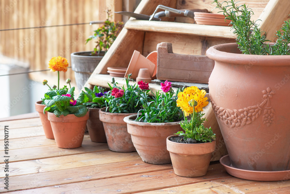 Fototapeta na wymiar - colorful flowers potted on the floor of a wooden terrace and terracotta flower pots on a shelf background with gardening equipment.