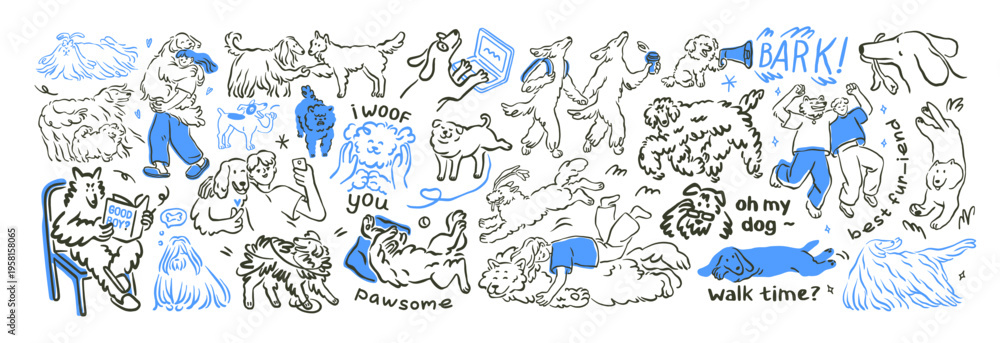 >Fototapety na wymiar>Wybrane motywy - zobacz więcej !>Kolej>Cute funny dogs in doodle outline style. Pets, canine animals, puppies activities, scribble line drawing, contour handdrawn sketches. Hand-drawn vector illustrations isolated on white background