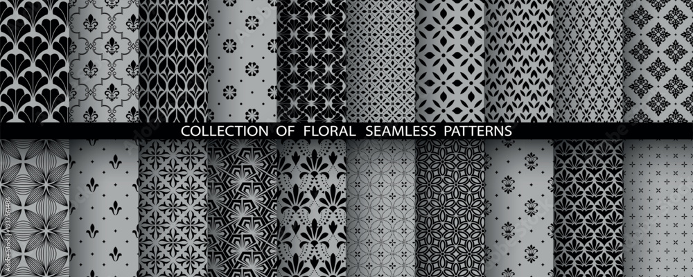 Fototapeta na wymiar - Geometric floral set of seamless patterns. Gray and black vector backgrounds. Damask graphic ornaments.
