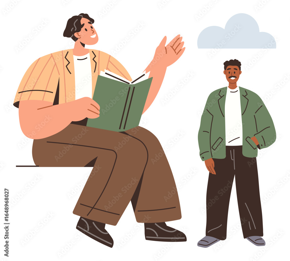 Fototapeta na wymiar - Two men in casual conversation, one reading and gesturing, another standing and listening. Ideal for education, communication, relationship, storytelling, mentorship, casual interaction learning.