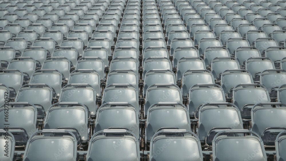 >Fototapety na wymiar>Wybrane motywy - zobacz więcej !>Konie>Rows of vacant metallic seats arranged for a corporate gathering or show, festival backdrop, design, commerce, workplace, illumination, sunlight, pale, athletics, stripe, group