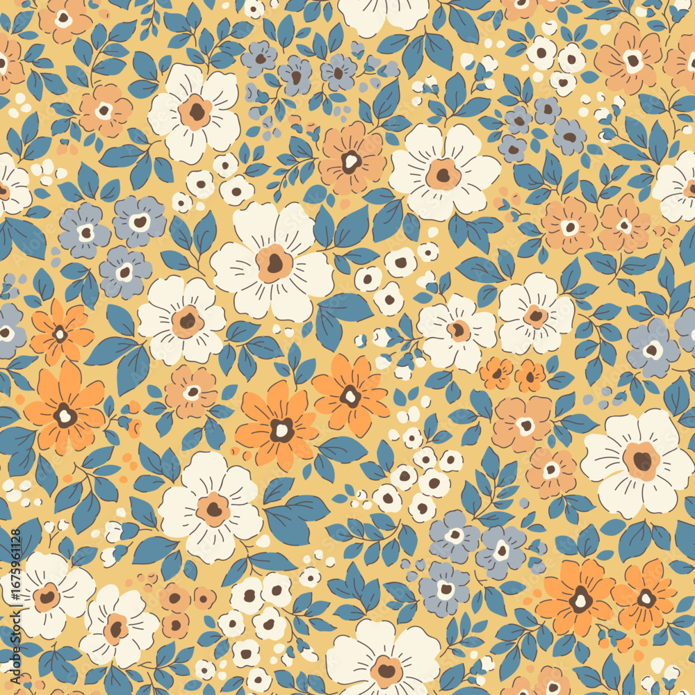 >Fototapety na wymiar>Wybrane motywy - zobacz więcej !>Konie>Retro floral pattern in small flowers. Small white and orange natural flowers. Gold yellow mustard background. Ditsy print. Floral seamless background. Cute vintage template for fashion prints. Stock
