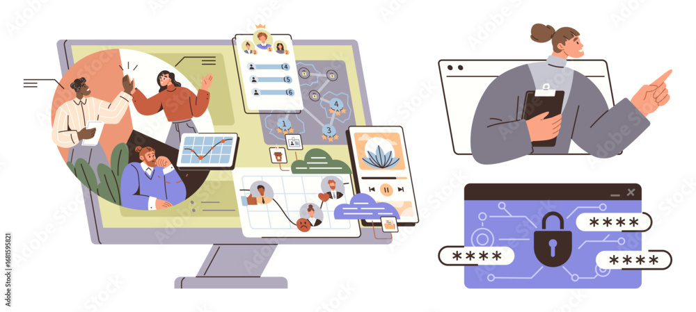 Fototapeta na wymiar - Computer screen with interactive tools, worker managing tasks, password security, network diagrams. Ideal for teamwork, technology, remote work, organization, privacy connections simple flat.