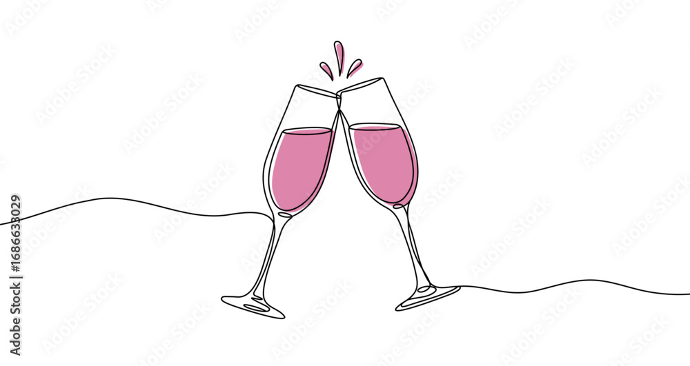 Fototapeta na wymiar - Two clinking rose champagne glasses in one line art style. Drawing with editable black stroke and pink liquid on white background. Vector illustration..