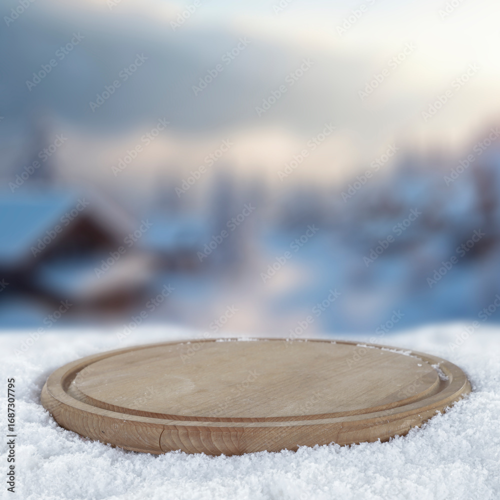 Fototapeta na wymiar - Empty copy space on fresh snow with background of frozen winter mountains and clear blue sky on sunny day. Concept of winter holidays, seasonal product placement, cold weather and mountain nature..