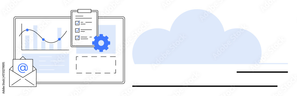 Fototapeta na wymiar - Graph on monitor alongside email, checklist, and gear near cloud symbol. Ideal for data storage, cloud computing, analytics, email solutions, task management, teamwork simple flat metaphor.