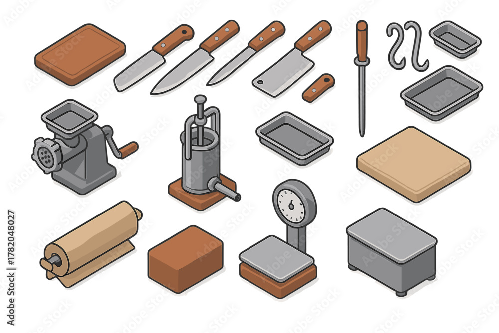 Fototapeta na wymiar - Essential tools assortment for meat processing and butchery, including knives, grinder, and scales.