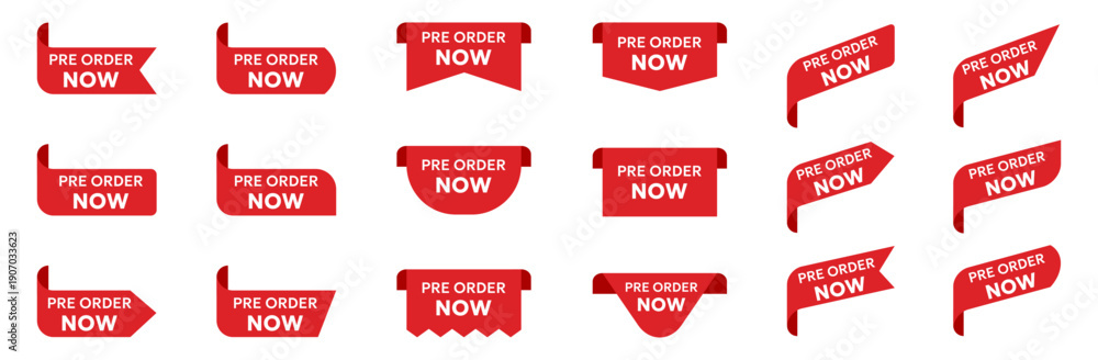 Fototapeta na wymiar - Pre order now ribbon labels collection in red style. Promotional call to action banners in flat design.