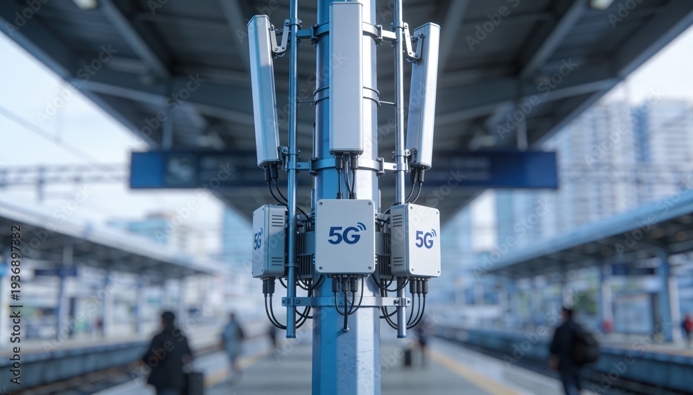 Fototapeta na wymiar - Medium shot of 5G smart pole at a transit hub showcasing antennas and edge compute units with blurred urban background for enhanced connectivity visuals..