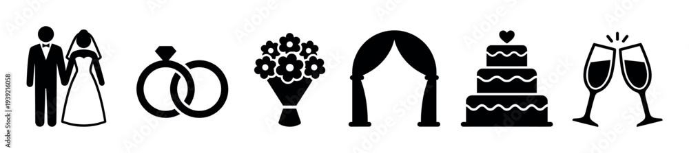Fototapeta na wymiar - Set of black wedding and marriage icons featuring a bride and groom, rings, bouquet, ceremony arch, tiered cake, and clinking glasses, presented in a clean, minimalist silhouette style.