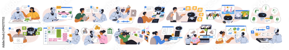 >Fototapety na wymiar>Wybrane motywy - zobacz więcej !>Konie>AI automation, digital technology set. Robot, chatbot assistants for analytics, generative content. Artificial intelligence and neural network. Flat vector illustration isolated on white background