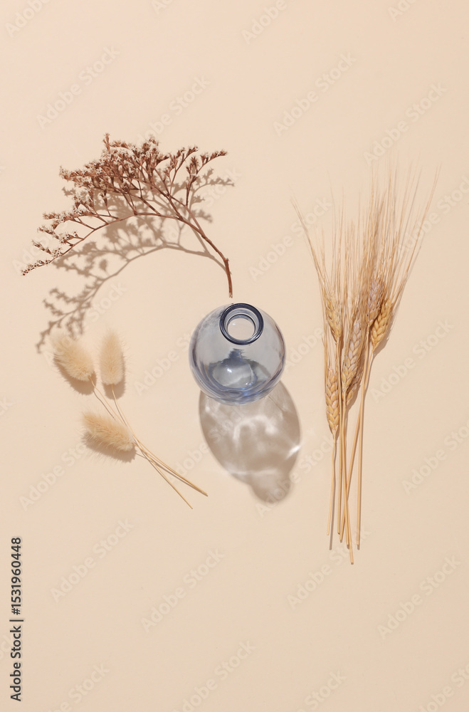 Fototapeta na wymiar - Glass vase with dried flowers on beige background with shadow from sunlight. Minimalistic aesthetic still life. Top view.