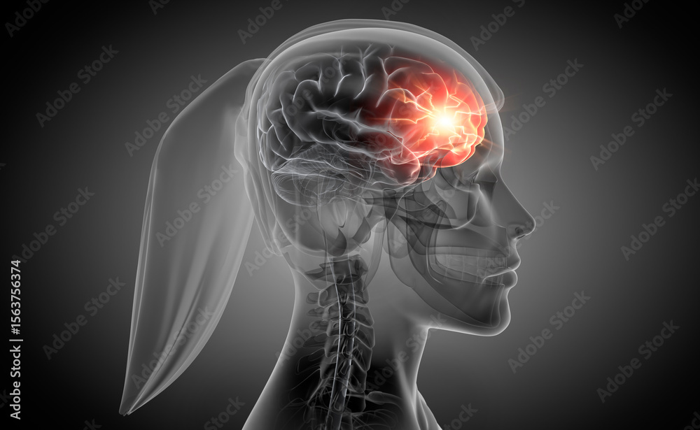 Fototapeta na wymiar - Woman with a strong headache - Brain Stroke - Medical X Ray 3D Illustration with dark gray background.