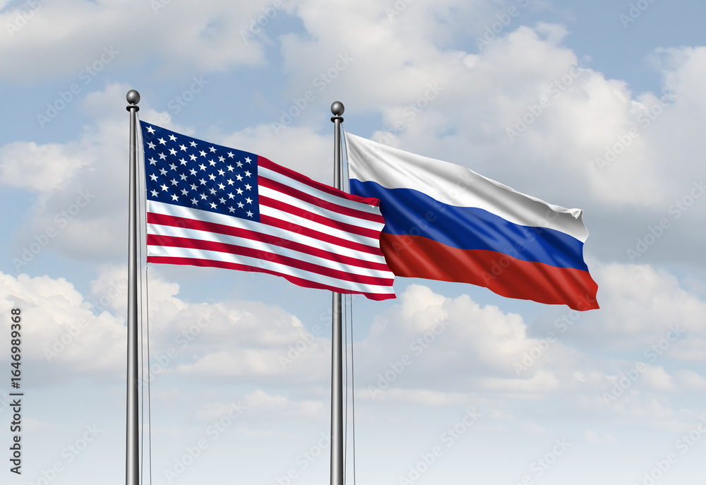 >Fototapety na wymiar>Wybrane motywy - zobacz więcej !>Kosmos>US And Russia Meeting as diplomatic flag symbols for negotiations concept to negotiate a ceasefire or peace agreement or cease fire to mediate mediation and arbitration betweem Moscow and Kyiv.