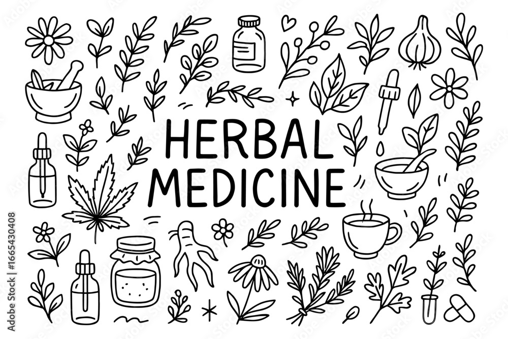 Fototapeta na wymiar - Herbal medicine elements in doodle style for natural healing and wellness themes.