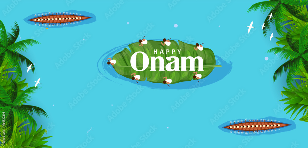 Fototapeta na wymiar - Sadya feast on banana leaf in celebration background for Happy Onam festival of South India Kerala.