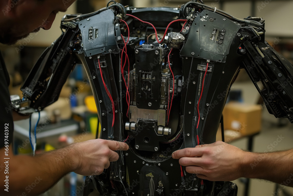 Fototapeta na wymiar - Engineer Assembling Humanoid Robot Internals.