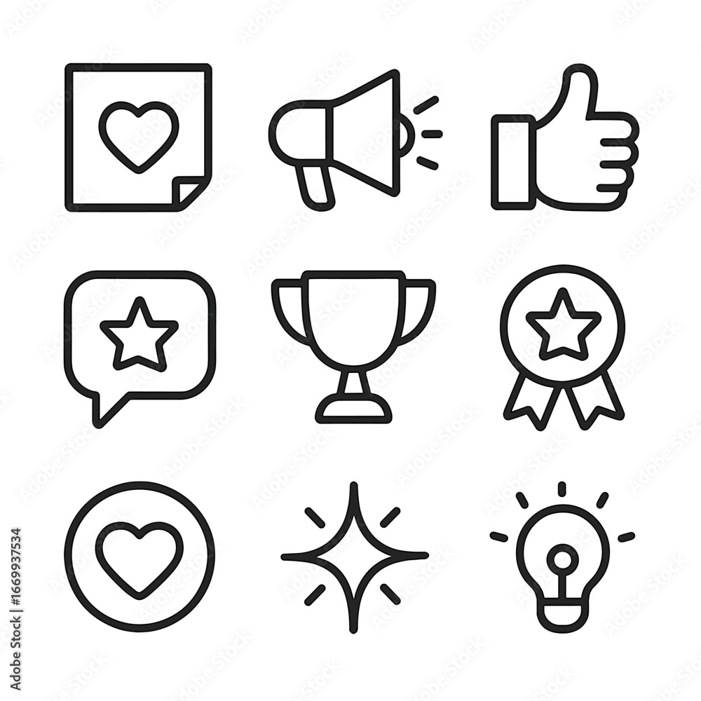 Fototapeta na wymiar - Motivational Icon Set. Outline icon set of motivational messages: sticky note with heart, megaphone shout, thumbs up, speech.