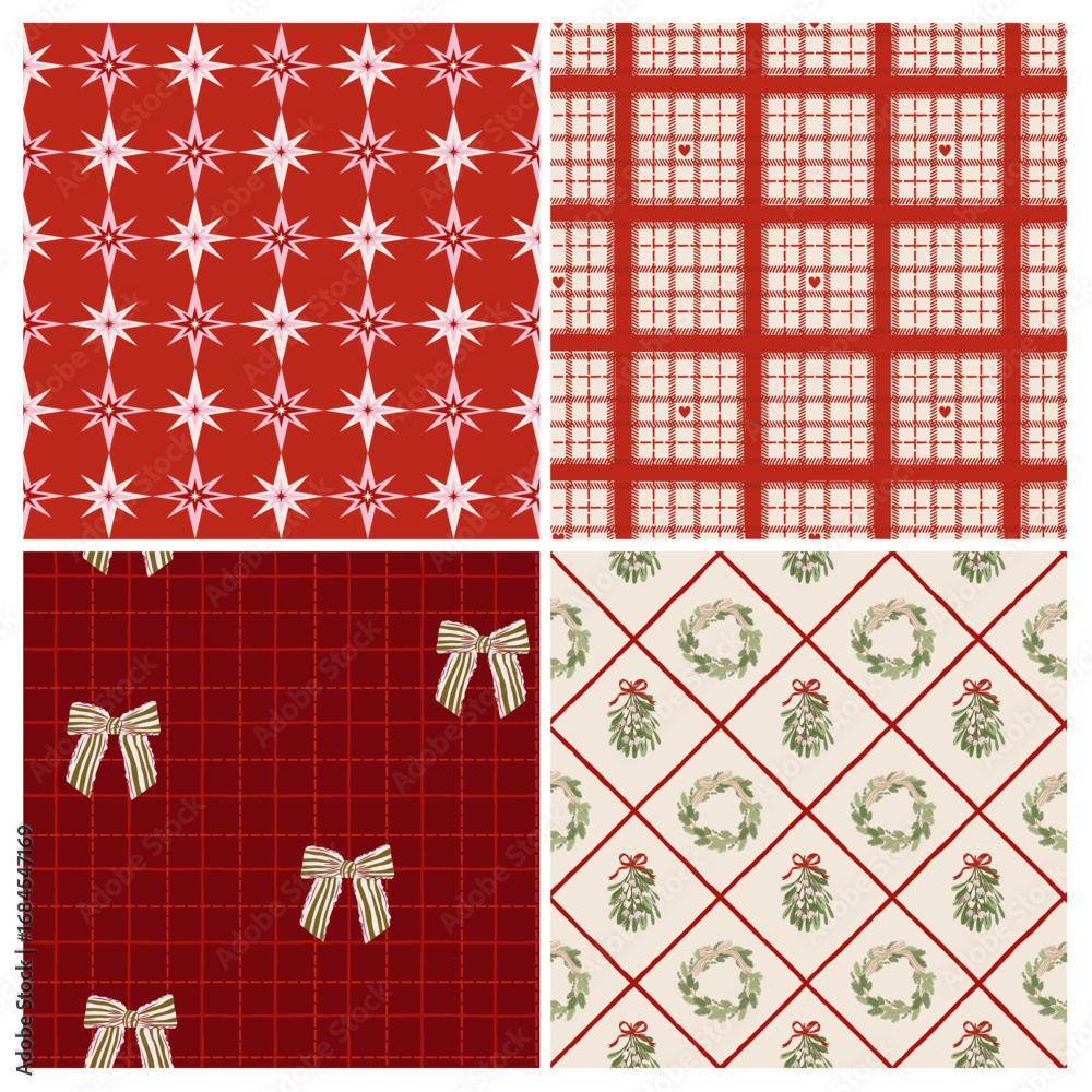 Fototapeta na wymiar - Cozy Christmas pattern set with stars, bows, plaids, and festive wreaths. Seamless vector design perfect for wrapping paper, greeting cards, fabrics, or winter decor projects..