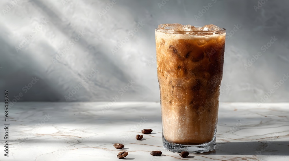 Fototapeta na wymiar - Iced coffee with milk and ice cubes in a tall glass on a marble surface with scattered coffee beans and natural light.