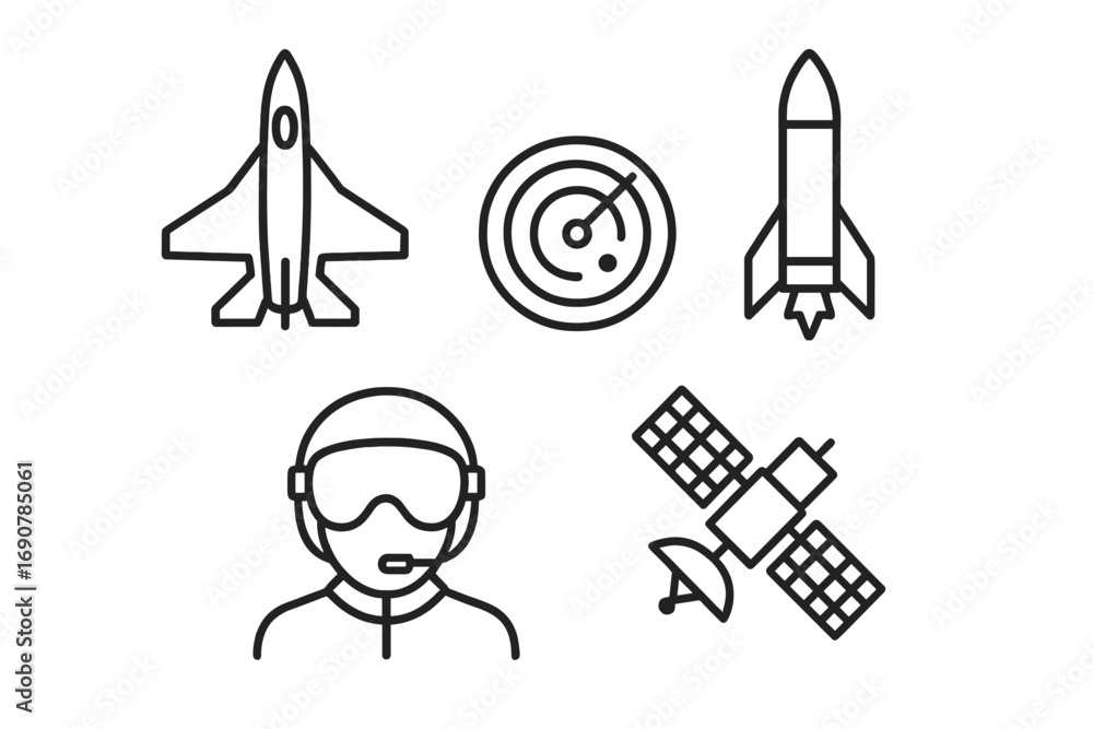Fototapeta na wymiar - Military aviation and aerospace technology line icon set with fighter jet, radar, rocket, pilot, and satellite symbols.