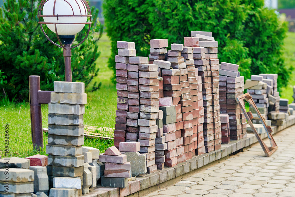 Fototapeta na wymiar - Paving stone repair and replacement with stacked slabs on sidewalk ready to restore and renovate damaged pedestrian pathway surface. Sidewalk repair process with paving slabs stacked in piles.