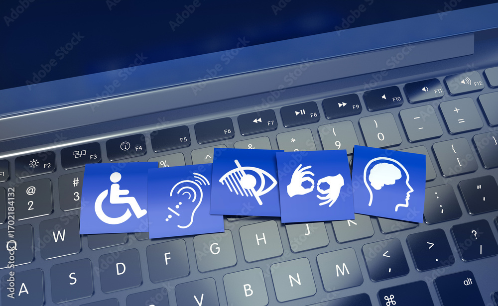 Fototapeta na wymiar - Accessibility Icons on a Laptop: A thought-provoking image of diverse accessibility icons neatly arranged on a laptop keyboard, representing various aspects of digital inclusivity in technology..