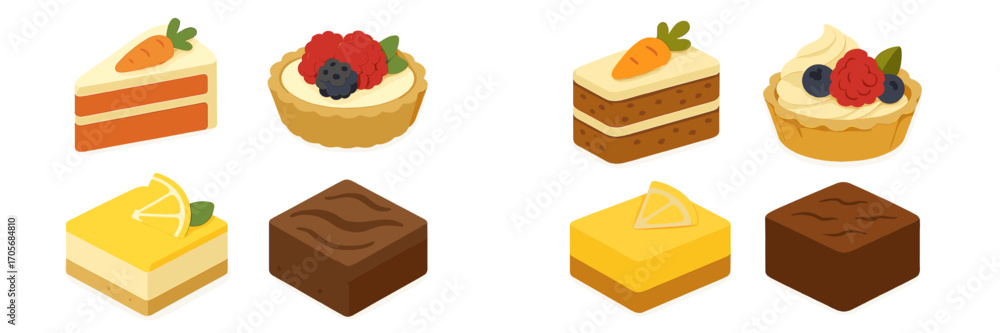 Fototapeta na wymiar - Assortment of delicious sweet desserts including carrot cake, berry tarts, lemon bars, and chocolate brownies, a gourmet selection.