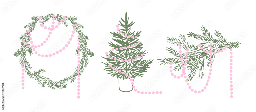 Fototapeta na wymiar - Set of holiday whimsical vintage Christmas tree, wreath, fir branch with decorations, retro beads. Elegant coquette clip art. Flat hand drawn vector illustration..