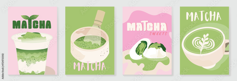 >Fototapety na wymiar>Wybrane motywy - zobacz więcej !>Kosmos>Matcha Green tea drinks poster template design set. Wallpaper of beverage, matcha latte art, green tea iced,Matcha mochi. Vector illustration for promotion, marketing, menu, packaging, ads.