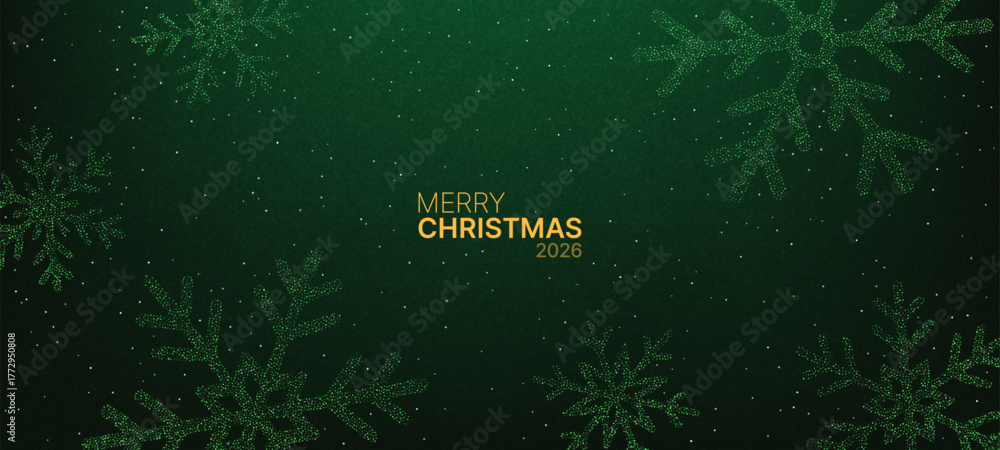 Fototapeta na wymiar - Merry Christmas 2026 text on a dark green background with glittering snowflake design. Festive winter holiday celebration..
