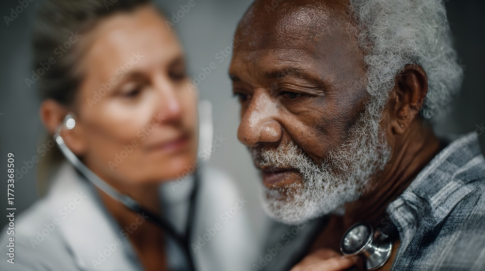 Fototapeta na wymiar - Doctor uses stethoscope to listen to elderly patient s heartbeat during medical examination.